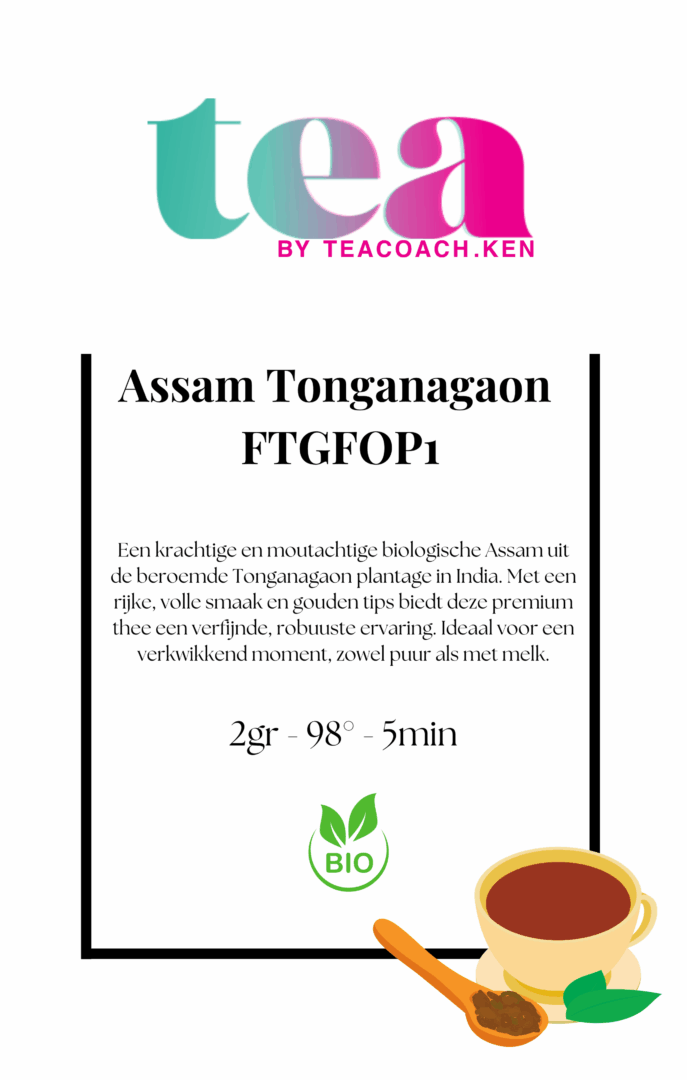 Herkomst: Tonganagaon is een theeplantage in de Assam-regio, een van de bekendste en grootste theeproducerende gebieden van India. De regio staat bekend om zijn vruchtbare grond en het tropische klimaat, wat bijdraagt aan de karakteristieke smaak van de thee.
