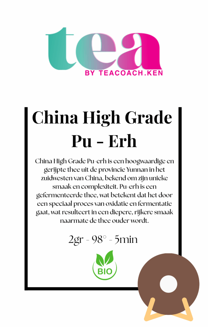 China High Grade Pu-erh is een hoogwaardige en gerijpte thee uit de provincie Yunnan in het zuidwesten van China, bekend om zijn unieke smaak en complexiteit. Pu-erh is een gefermenteerde thee, wat betekent dat het door een speciaal proces van oxidatie en fermentatie gaat, wat resulteert in een diepere, rijkere smaak naarmate de thee ouder wordt. Hier is wat meer informatie over deze bijzondere thee: