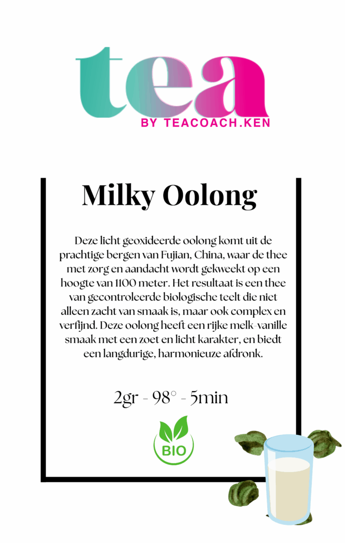 Milky Oolong is een type oolongthee die bekendstaat om zijn romige, melkachtige smaak en textuur. Het is een licht geoxideerde thee die vaak een natuurlijke zoetheid en een zacht, boterachtig karakter heeft. Hoewel sommige varianten van milky oolong een subtiele melkachtige smaak hebben die van nature in de theebladeren zit, kan in andere gevallen de melksmaak worden versterkt door een traditioneel productieproces waarbij de thee op een speciale manier wordt verwerkt.