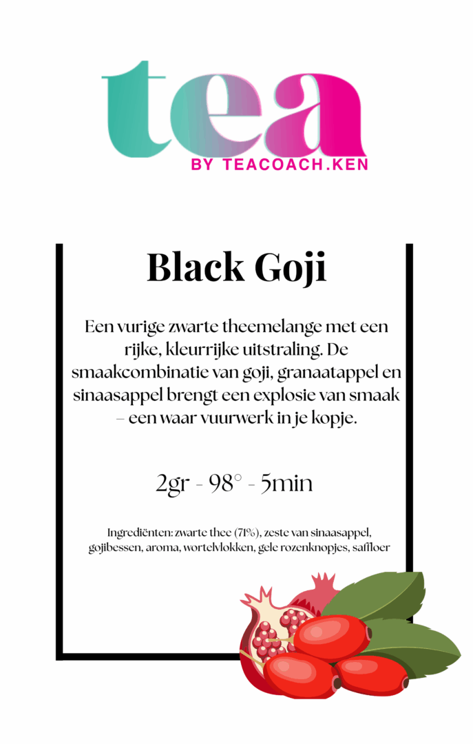 Ingrediënten: zwarte thee (71%), zeste van sinaasappel, gojibessen, aroma, wortelvlokken, gele rozenknopjes, saffloer